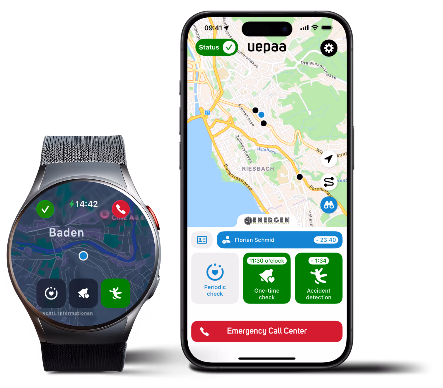 The sensors and timers in the app recognize a potential accident. If the pre-alarm is not acknowledged, the Uepaa emergency call center takes over.
